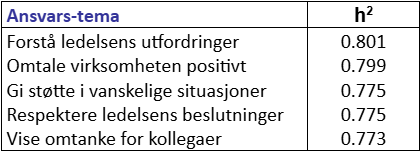 I selvvurderingen sier de fleste at de er sterke på å respektere ledelsens beslutninger, være kvalitetsbevisst i jobben og gi kolleger støtte i vanskelige situasjoner. Det stemmer overens med tilbakemeldingene de får fra kolleger, som i tillegg gir anerkjennelse for at de satser ekstra når det trengs. Mest selvkritisk er de fleste når det gjelder egen evne til å tenke nytt i jobben, involvere kollegene og ta ansvar for bedriftens renommé. Dette avviker fra tilbakemeldingene som peker på omtanke for kolleger og å omtale virksomheten positivt internt. Negativt snakk om forhold man ikke liker ved bedriften eller ledelsen, er et generelt problem på mange arbeidsplasser.
